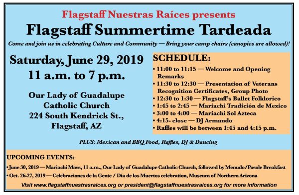 FLAGSTAFF, AZ (June 21, 2019) — To celebrate and recognize Flagstaff’s Hispanic roots, Flagstaff Nuestras Raíces invites the public to attend its fifth annual “Flagstaff Summertime Tardeada — Mariachi and Folklorico Festival” from 11 a.m. to 7 p.m. Saturday, June 29 at Our Lady of Guadalupe Catholic Church, 224 S. Kendrick St., Flagstaff.