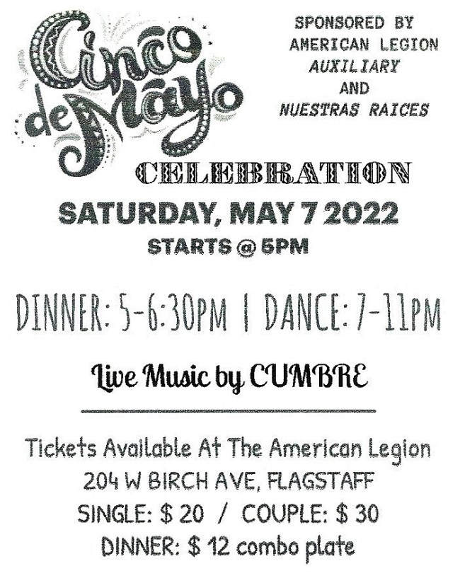 FLAGSTAFF — The Cinco de Mayo Celebration, dinner/dance will return at 5 p.m. Saturday, May 7 at The American Legion, 204 W. Birch Ave., Flagstaff.
