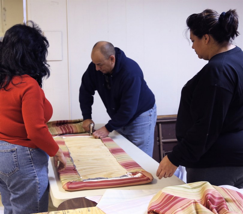 OLG01 November 23, 2013 999 × 884 OLG01 Members of Flagstaff Nuestras Raíces create seat covers for the benches at the Our Lady of Guadalupe basement on Nov. 23, 2013 in Flagstaff, AZ. Photo by AmigosNAZ ©2013